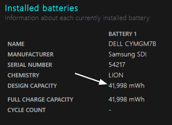 Busque la capacidad de diseño y divida el número que ve por mil. Si hay una diferencia entre la capacidad de diseño y la capacidad de carga completa, significa que la batería del portátil en el que se encuentra se ha desgastado ligeramente.