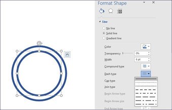 Para ello, haga clic con el botón derecho del ratón en la segunda imagen y seleccione Formatear forma. Dirígete a Línea y selecciona uno de los muchos tipos de guión disponibles.