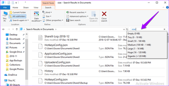 Abra el explorador de archivos pulsando el acceso directo de Windows + E. En la esquina superior derecha verá la conocida barra de búsqueda. Escribe el tamaño : para mostrar un menú desplegable oculto.
