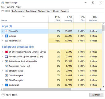 El Administrador de Tareas sólo lista los servicios de iTunes y Bonjour.